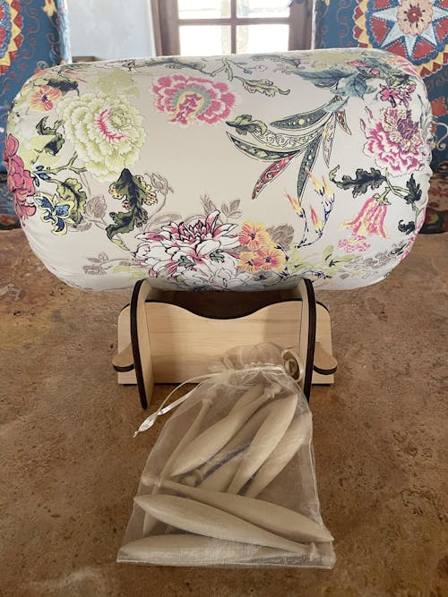 What a beautiful pillow, stand, and bobbins set. Well worth the wait. Can't wait to start using them! Included a gift pattern, as well. Thanks so much!